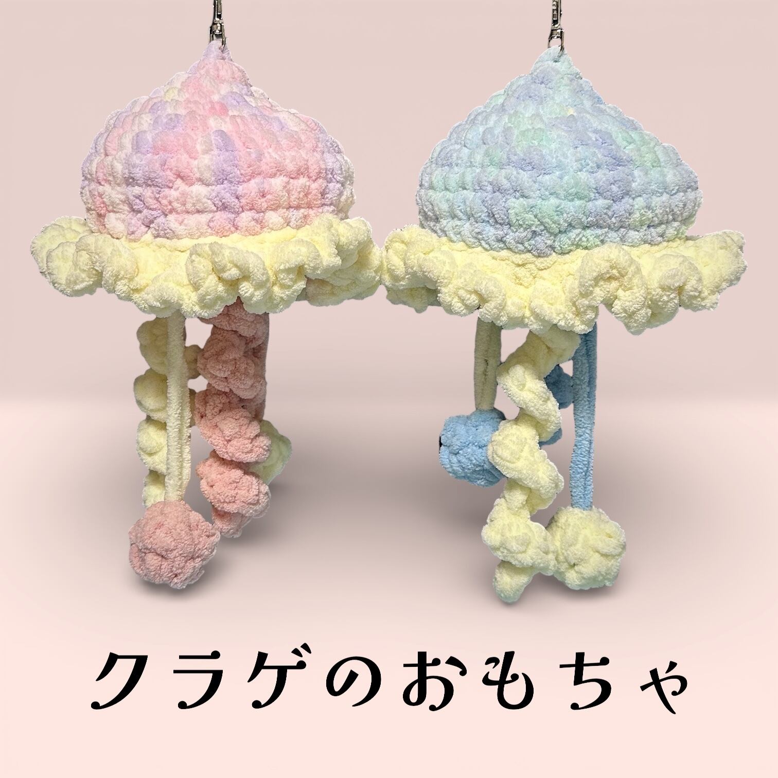 お顔ぽーちと同じ毛糸を使い、手編みで製作したクラゲトイ。
